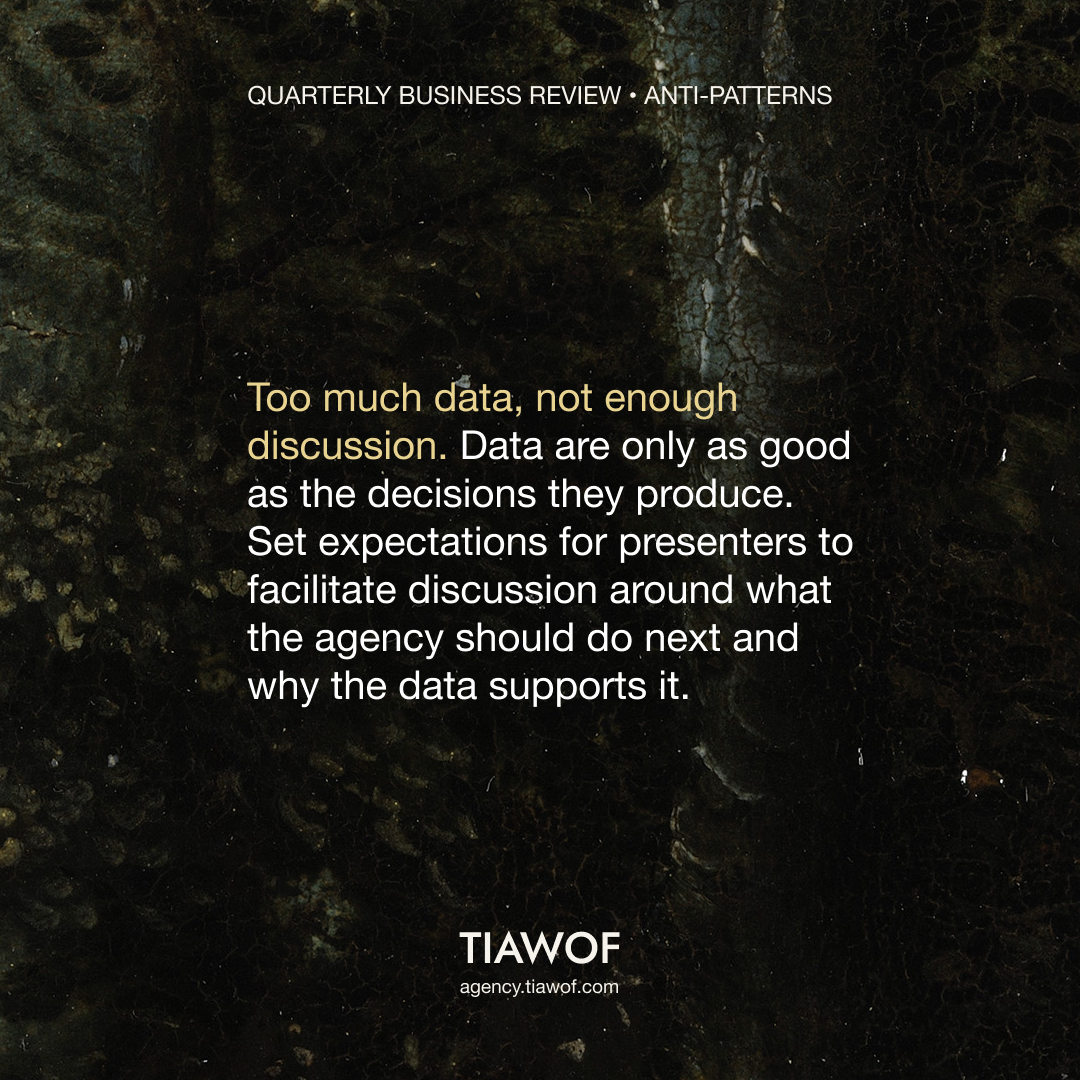 By leading with a hypothesis around action the agency should take in the coming quarter, and then using data to back that up, presenters must contextualize the data for the others. It also helps them filter out unnecessary data, as only data supporting their recommendations is brought into the conversation.