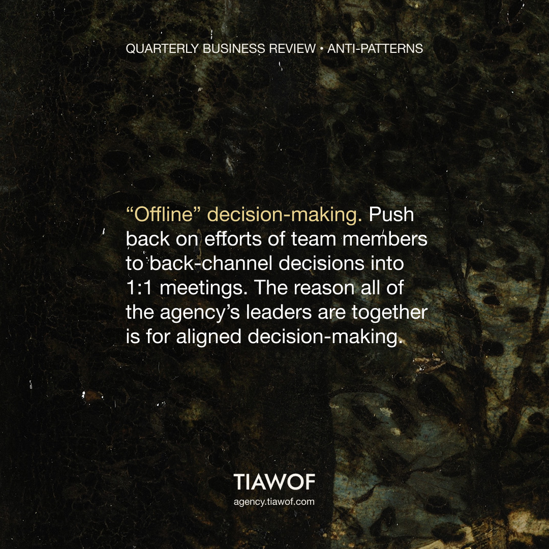 Kindly ask that folks save urgent, but not important discussions for break time or after QBR. Common culprits will include low-level drama on in-flight client projects, overdue client invoices of $500, and intractable “HR” matters, which honestly, are never going to get resolved until so-and-so just develops some emotional intelligence.